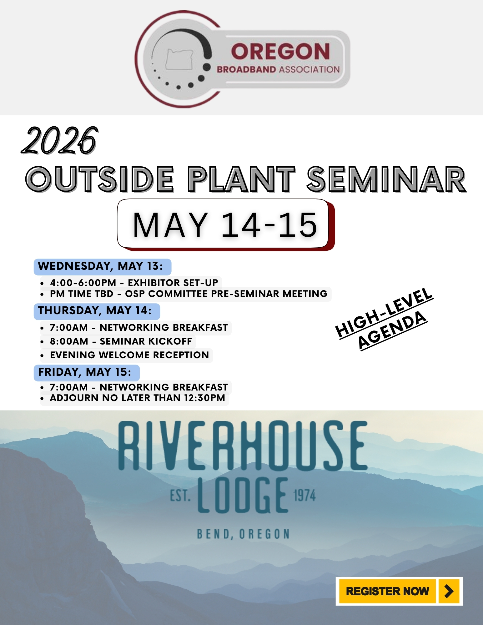- We have a limited amount of rooms under our negotiated block. Book your lodging reservations early on the web or call (541)-389-3111 and mention the OBA Outside Plant Seminar! In addition, our negotiated rates are available +/-3 days of the event. Email mjundt@oba-telecom.org if you have any trouble securing a room or the dates you need.